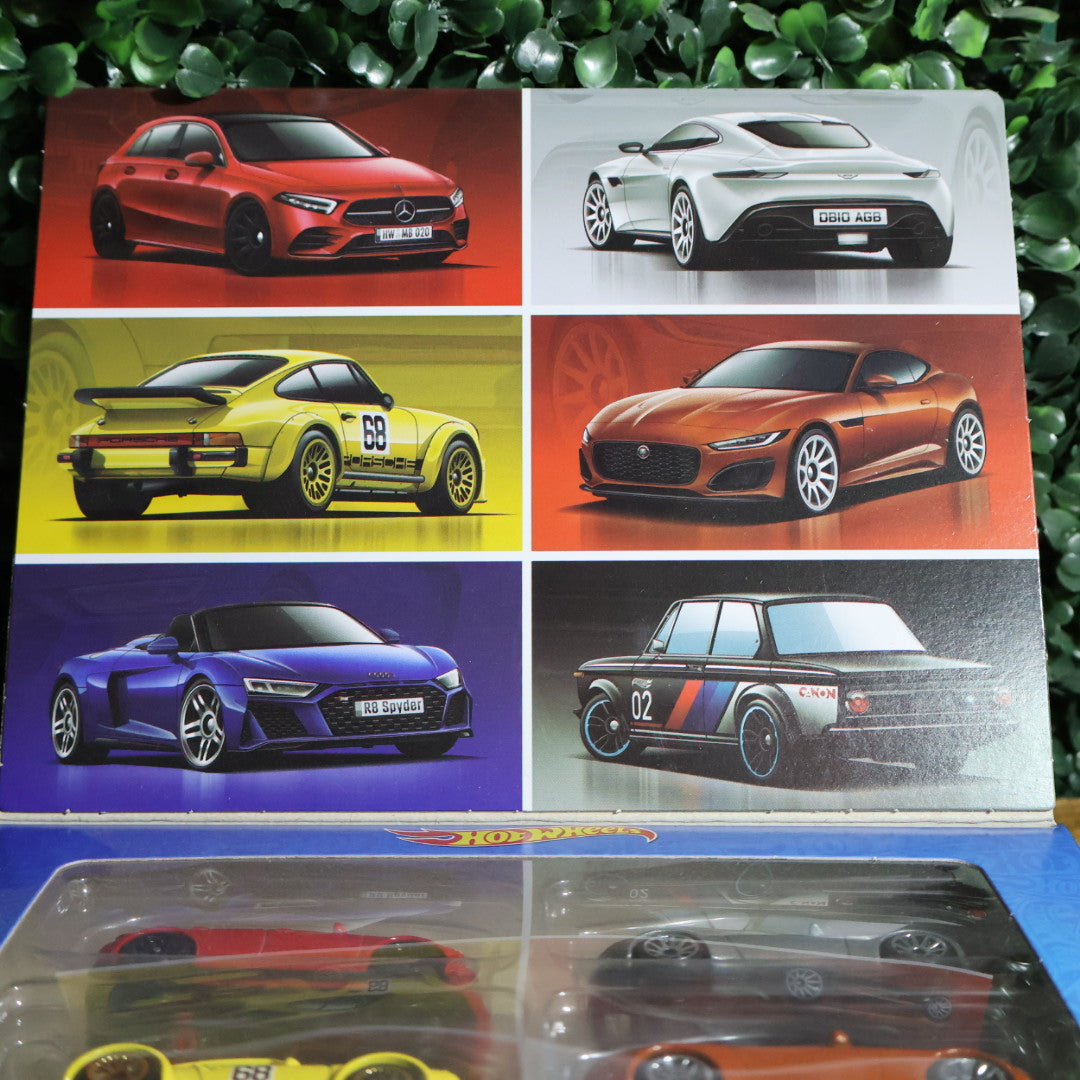 Hot Wheels Premium Set de 6 Carros Europeos de Lujo - Set exclusivo de 6 superdeportivos y autos de lujo europeos. Incluye: '18 Mercedes-Benz A-Class (rojo), Aston Martin DB10 (plata), Porsche 934 Turbo RSR #68 (amarillo), 2020 Jaguar F-Type (naranja), 2018 Audi R8 Spyder (azul) y BMW 2002 #02 (negro/blanco). Set premium con acabados metálicos, llantas cromadas y detalles ultra realistas. Productos oficiales licenciados por Mercedes-Benz, Aston Martin, Porsche, Jaguar, Audi y BMW. Perfecto para coleccionistas de autos europeos de lujo, superdeportivos y sets premium exclusivos de Hot Wheels.