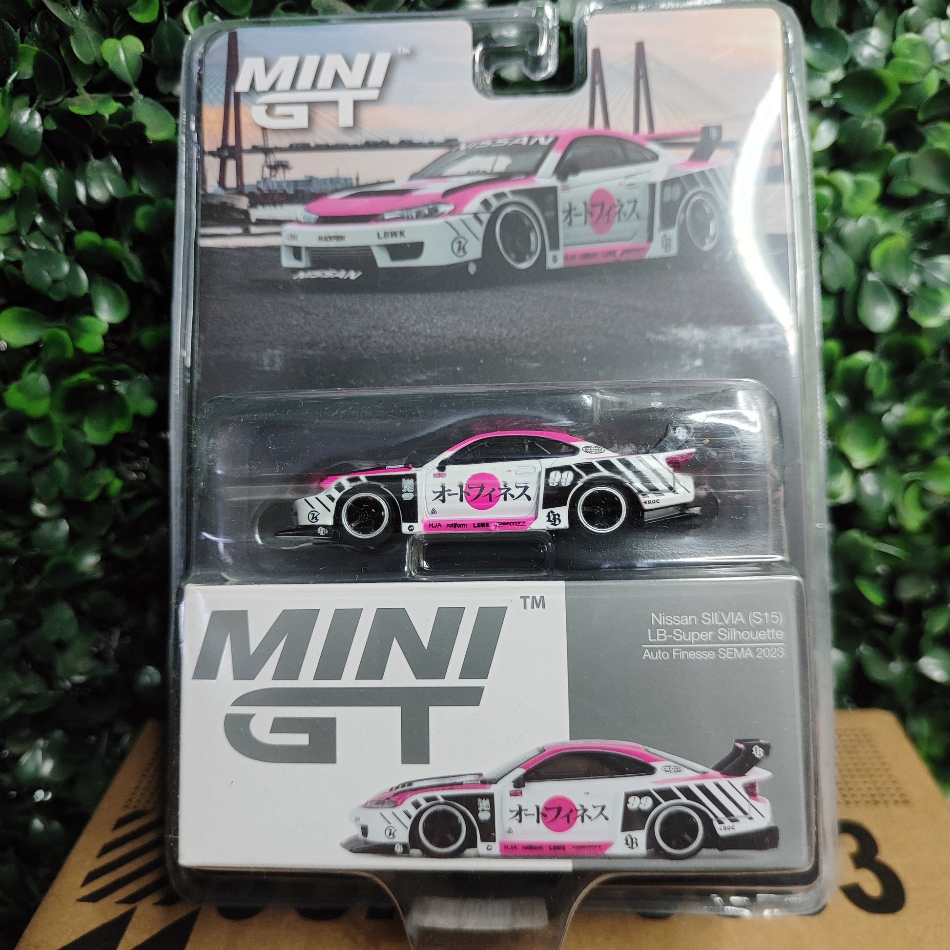 Mini GT Nissan Silvia (S15) LB-Super Silhouette - Nissan Silvia S15 con kit Liberty Walk Super Silhouette en color blanco y rosa con decoración Auto Finesse. Auto Finesse SEMA 2023. Edición Premium escala 1:64. Réplica del Nissan Silvia S15 modificado con kit de carrocería extrema LB-Super Silhouette, alerones masivos, gráficos Auto Finesse en japonés, llantas negras y detalles ultra realistas del SEMA 2023. Perfecto para coleccionistas de Nissan, Silvia S15, Liberty Walk, SEMA y ediciones Premium Mini GT.